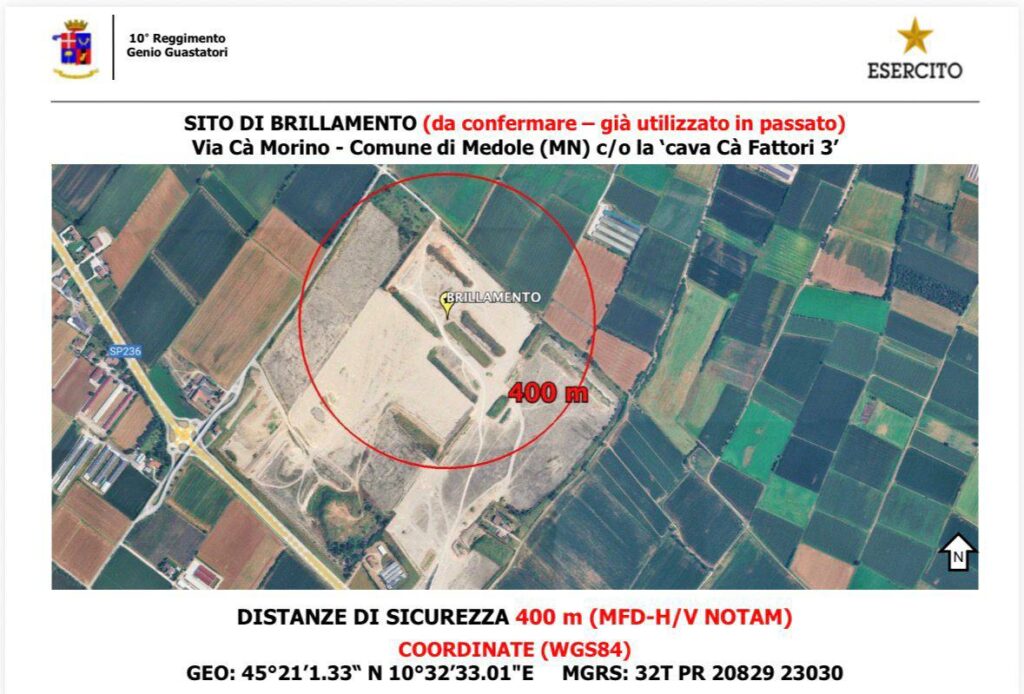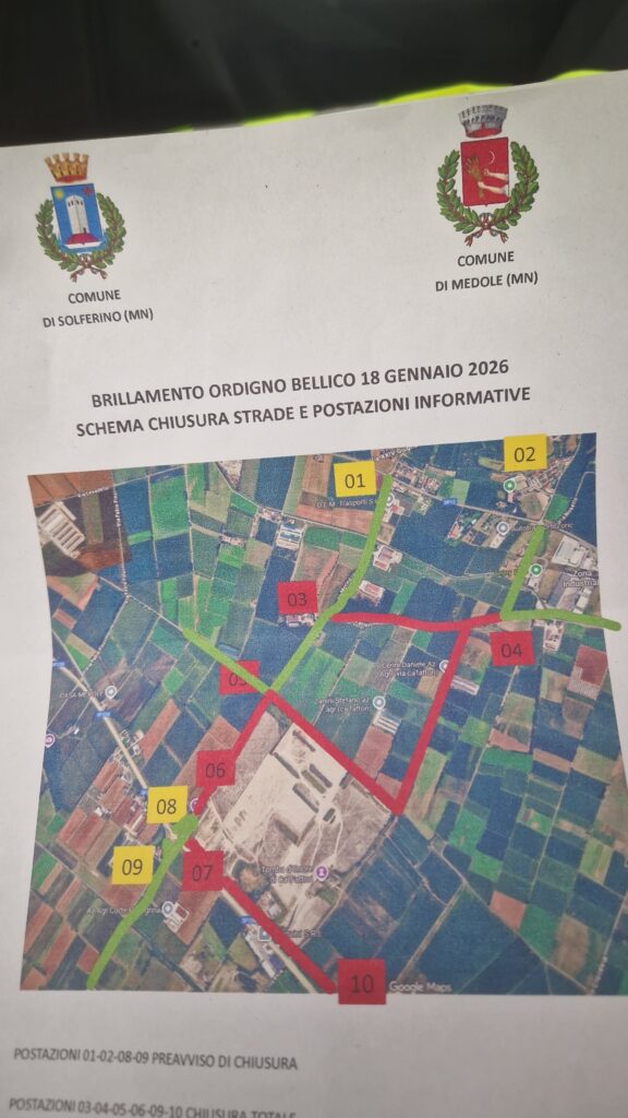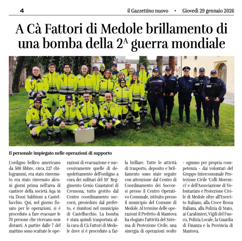 Venerdì 16 gennaio 2026 nel corso di una tranquilla pausa pranzo che aveva già il gusto del weekend ho ricevuto una telefonata che in un secondo ha stravolto i programmi di relax. Una bomba inesplosa di 500 libbre, circa 227 kg, contenente oltre 119 chili di esplosivo ad alto potenziale, era stata rinvenuta, in ottimo stato di conservazione e ancora attivo, all’interno del territorio del comune di Castellucchio (MN), durante i lavori di raddoppio della linea ferroviaria Cremona-Mantova. Nello specifico il 10° Reggimento Genio Guastatori di Cremona a seguito di ricognizione tecnica effettuata da personale specialistico “CMD” aveva identificato l’ordigno come “bomba d’aereo da 500 lbs modello GP AN-M 64 di nazionalità statunitense” risalente alla Seconda Guerra Mondiale. Cosa c’entravo io in tutto questo penserete voi. Presto detto: era richiesta l’attivazione del volontariato di Protezione Civile per dare supporto alle operazioni di brillamento programmate per la domenica successiva e quindi ho dovuto coordinare il Gruppo Intercomunale di Protezione Civile “Colli Morenici” per tale attività. Fortunatamente avevo già un’idea di ciò che c’era da fare, poiché pochi mesi prima avevo partecipato ad una missione identica con la colonna mobile provinciale a Sermide (MN) e fondamentalmente il compito era speculare: presidio della zona rossa e supporto alla popolazione. Domenica 18 gennaio la bomba è stata trasportata dagli artificieri dell’Esercito Italiano da Castellucchio alla cava “Cà Fattori” nel Comune di Medole (sito questo selezionato per garantire lo svolgimento delle operazioni in totale sicurezza) e alle ore 14:33 dopo un suggestivo e hollywoodiano countdown è stata fatta brillare con successo. Tutte le attività di trasporto, deposito e brillamento sono state seguite con attenzione dal Centro di Coordinamento dei Soccorsi presso il Centro Operativo Comunale, istituito presso il municipio del Comune di Medole. Al termine delle operazioni il Prefetto di Mantova ha elogiato l’attività del Sistema di Protezione Civile, una sinergia di operazioni svolte – ognuno per propria competenza – dai volontari del Gruppo Intercomunale Protezione Civile “Colli Morenici” e del Associazione di Volontariato e Protezione Civile Medole, oltre all’Esercito Italiano, la Croce Rossa Italiana, la Polizia di Stato, i Carabinieri, i Vigili del Fuoco, la Polizia Locale, la Guardia di Finanza e la Provincia di Mantova.