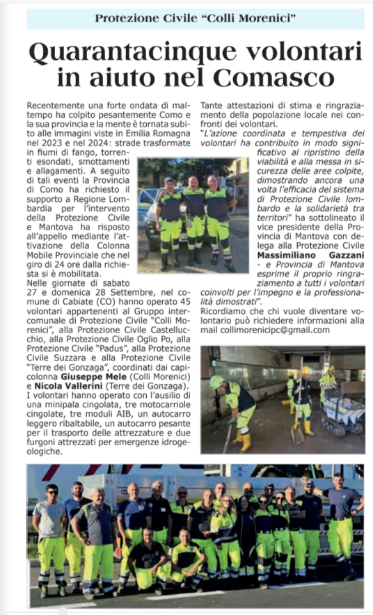 Alla fine del mese di settembre 2025 la Provincia di Como è stata funestata da forti precipitazioni che hanno causato ingenti danni al territorio. A causa di una eco mediatica non particolarmente incisiva l’evento è passato quasi in sordina per chi vive lontano da quei territori, me compreso, ciò nonostante venerdì 26 le percezioni della gravità della situazione sono diventate più nitide a seguito dell’attivazione della colonna mobile provinciale. La Provincia di Como ha richiesto il supporto a Regione Lombardia e nel giro di 24 ore 45 volontari della Provincia di Mantova si sono mobilitati per raggiungere la località di Cabiate (CO). Nello specifico hanno operato i Volontari dei gruppi di Protezioni Civile “Colli Morenici”, Padus, Castellucchio, Terre dei Gonzaga, Oglio Po e Suzzara coordinati nelle due giornate di missione da me e dal mio espertissimo collega Nicola Vallerini (Terre dei Gonzaga). Una volta giunti sul luogo la mente è tornata inevitabilmente subito alle immagini viste in Emilia Romagna nel 2023 e nel 2024: strade trasformate in fiumi di fango, torrenti esondati, smottamenti, allagamenti, automobili devastate e oggetti della quotidianità casalinga accatastati lungo le vie cittadine. Mediante l’ausilio di una minipala cingolata, tre motocarriole cingolate, tre moduli AIB, un autocarro leggero ribaltabile, un autocarro pesante per il trasporto delle attrezzature e due furgoni attrezzati per emergenze idrogeologiche abbiamo svolto diverse operazioni di bonifica sia in abitazioni private che opifici. Grazie alla grande professionalità dei Volontari, alle abilità tecniche acquisite in innumerevoli ore di addestramento e soprattutto grazie alla capacità di operare in squadra, anche con operatori mai visti prima di quel giorno, tutte gli incarichi che ci sono stati affidati sono stati portati a termine. Tante sono state le attestazioni di stima. Siamo tornati a casa stanchi, ma contenti e abbiamo riposto nel nostro zaino dei sentimenti un altro ricordo di sguardi di speranza e gratitudine della popolazione che porteremo per sempre nei nostri cuori.
