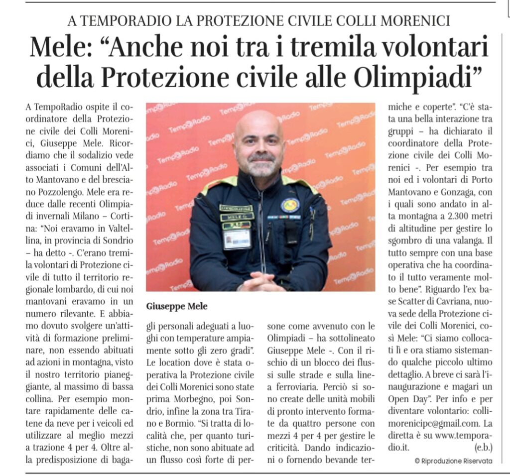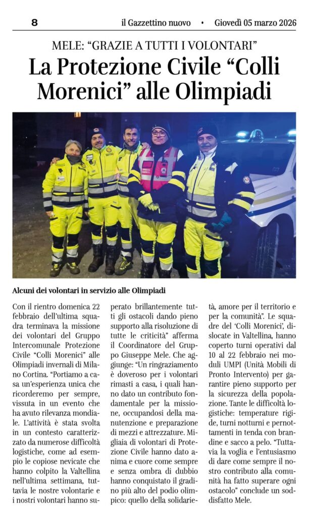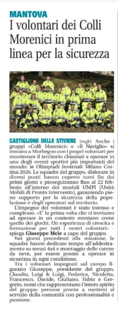 Un evento unico, di portata mondiale, che resterà nella storia e nei cuori di chi vi ha preso parte. Anche i volontari del Gruppo Intercomunale Protezione Civile “Colli Morenici” hanno contribuito al successo delle Olimpiadi Invernali Milano Cortina 2026, partecipando a una missione straordinaria che li ha visti operare in prima linea in Valtellina insieme a tanti altri volontari provenienti da tutta la Lombardia.
